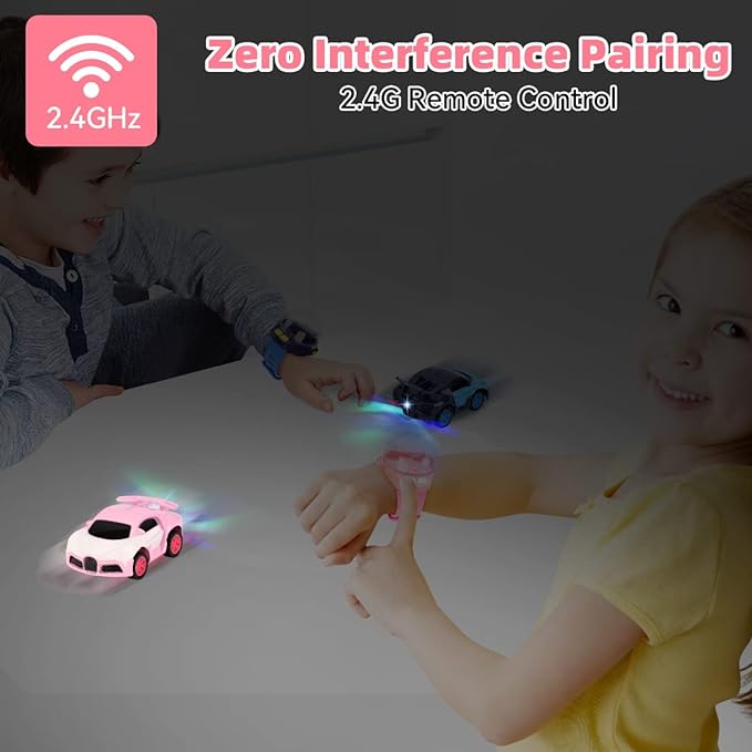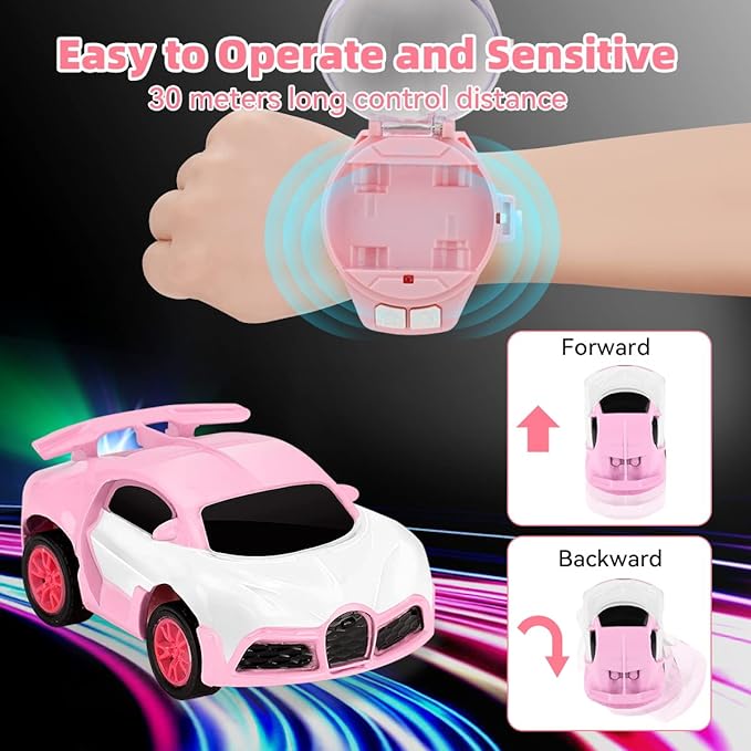【Wrist Watch Toy with LED Light】 When the switch is turned on, the taillights will flash. Toys for 3+ year old boy and girl can be worn on the wrist and play anytime, anywhere. The RC car watch is controlled with 2 buttons to go forward and backward, easy to operate.