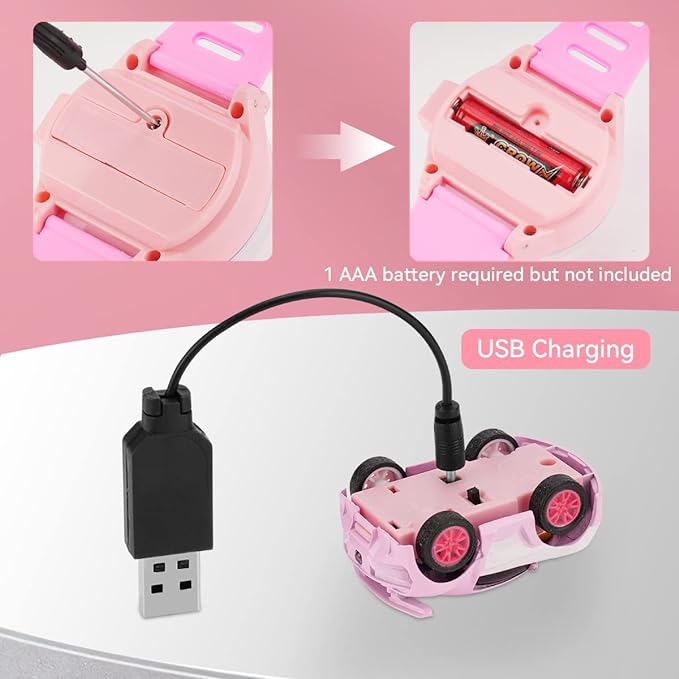 【2.4GHz Watch Remote Control Car】 The cute wrist racing car watch is effectively controlled within a maximum linear infrared distance of around 30m. The car games watch toy is equipped with USB cable, which can be connected to common usb devices. and the controller is powered by 1 AAA batteries, but not included. Can play about 20mins after fully charged.