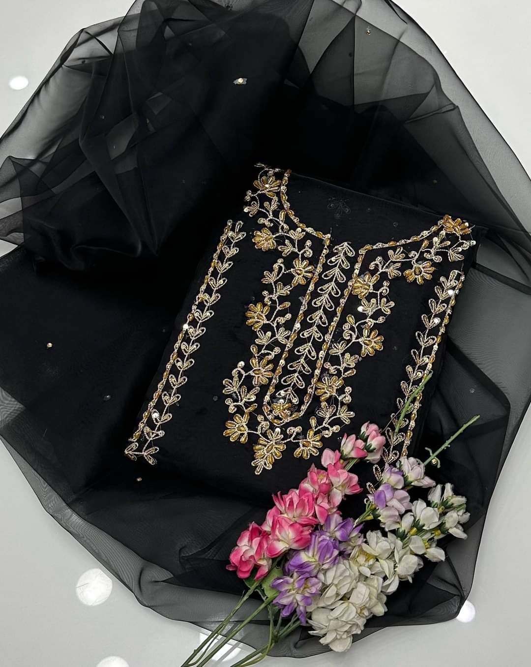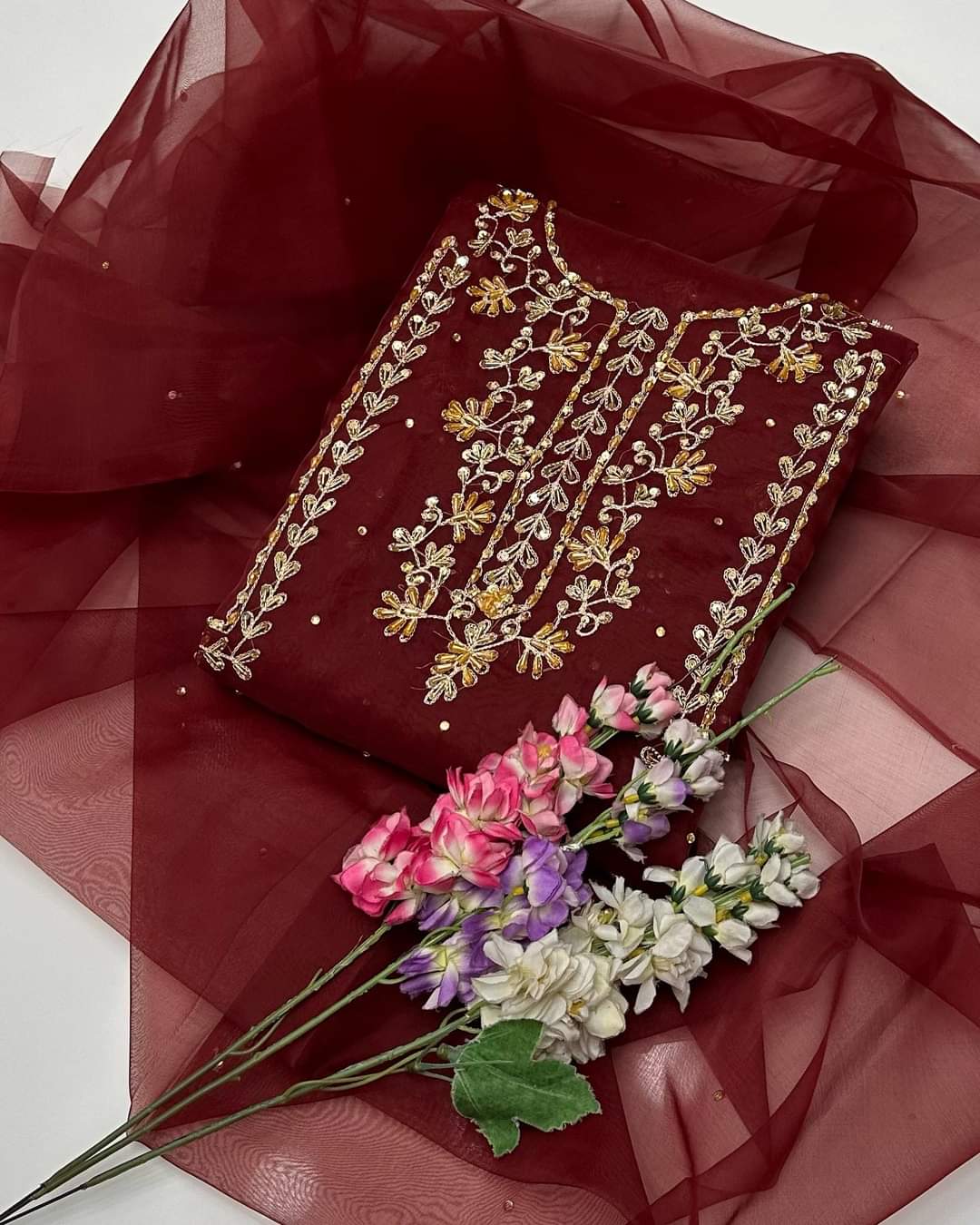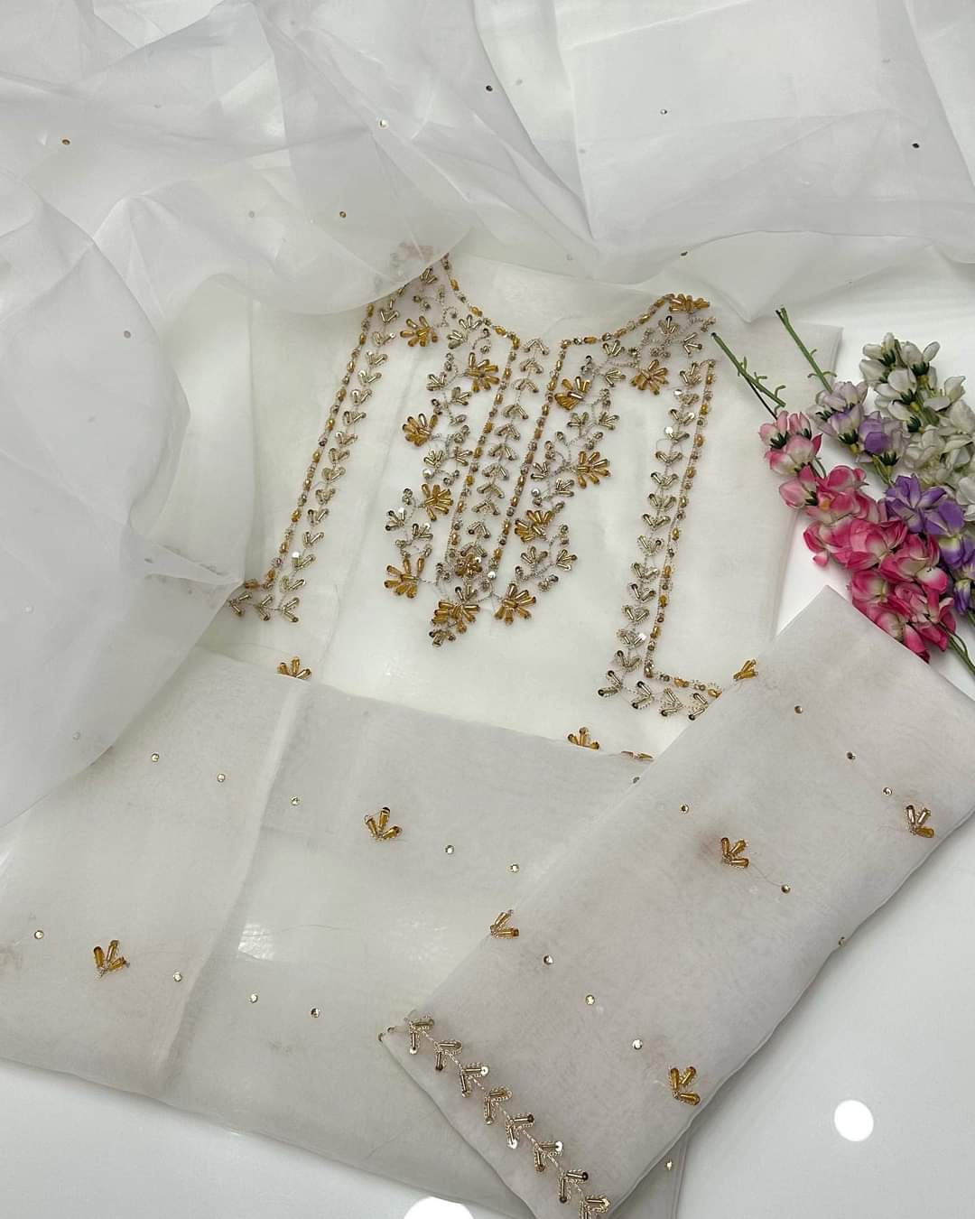 2 pcs Organza zarri beads work shirt and dupatta