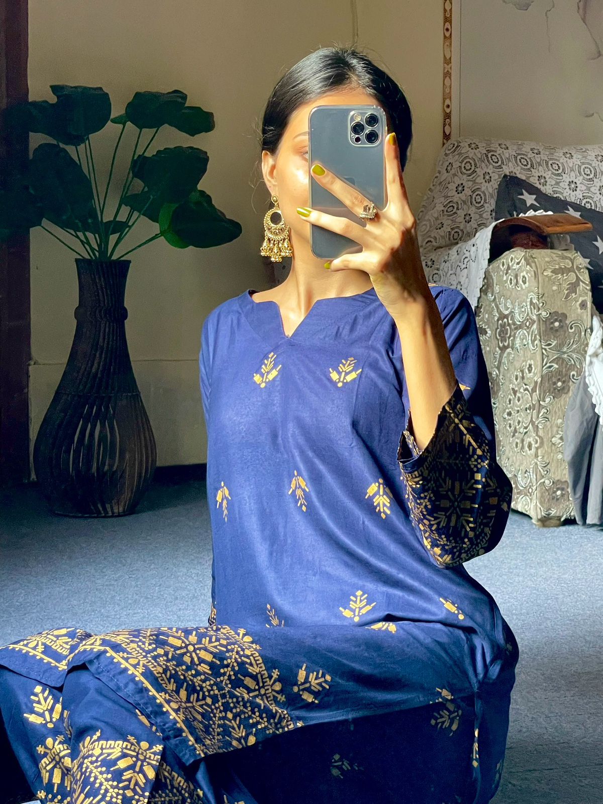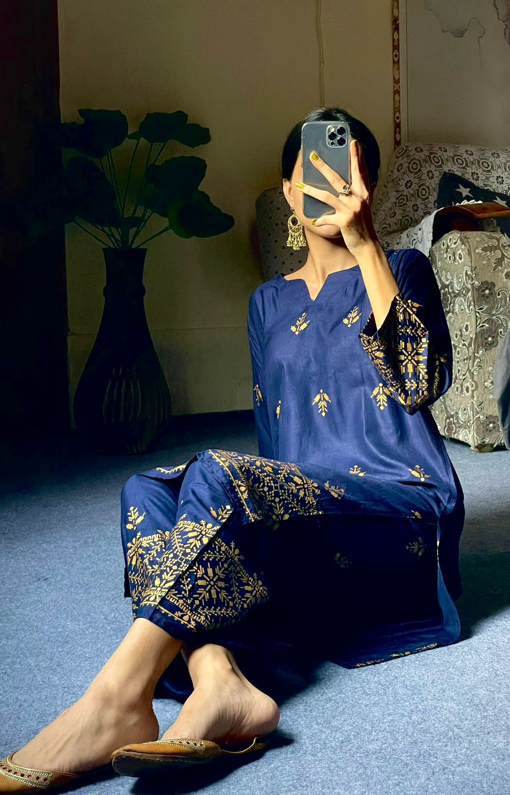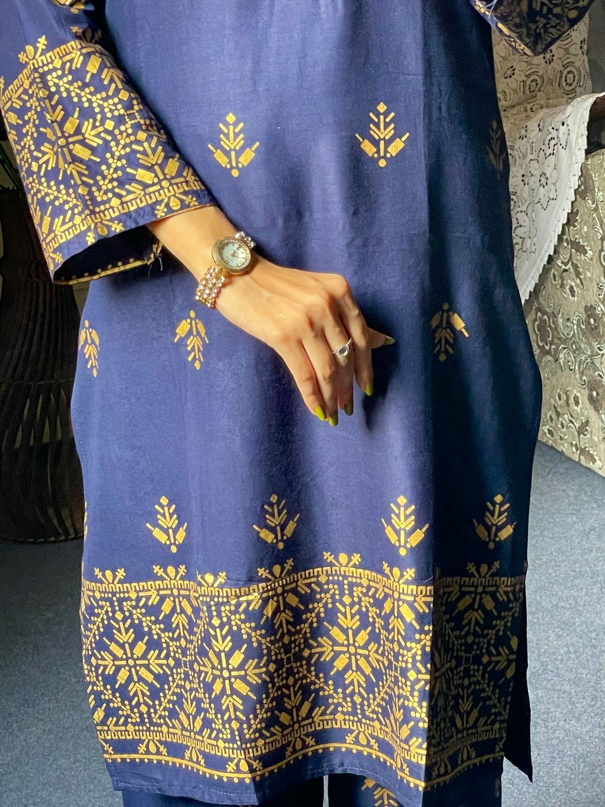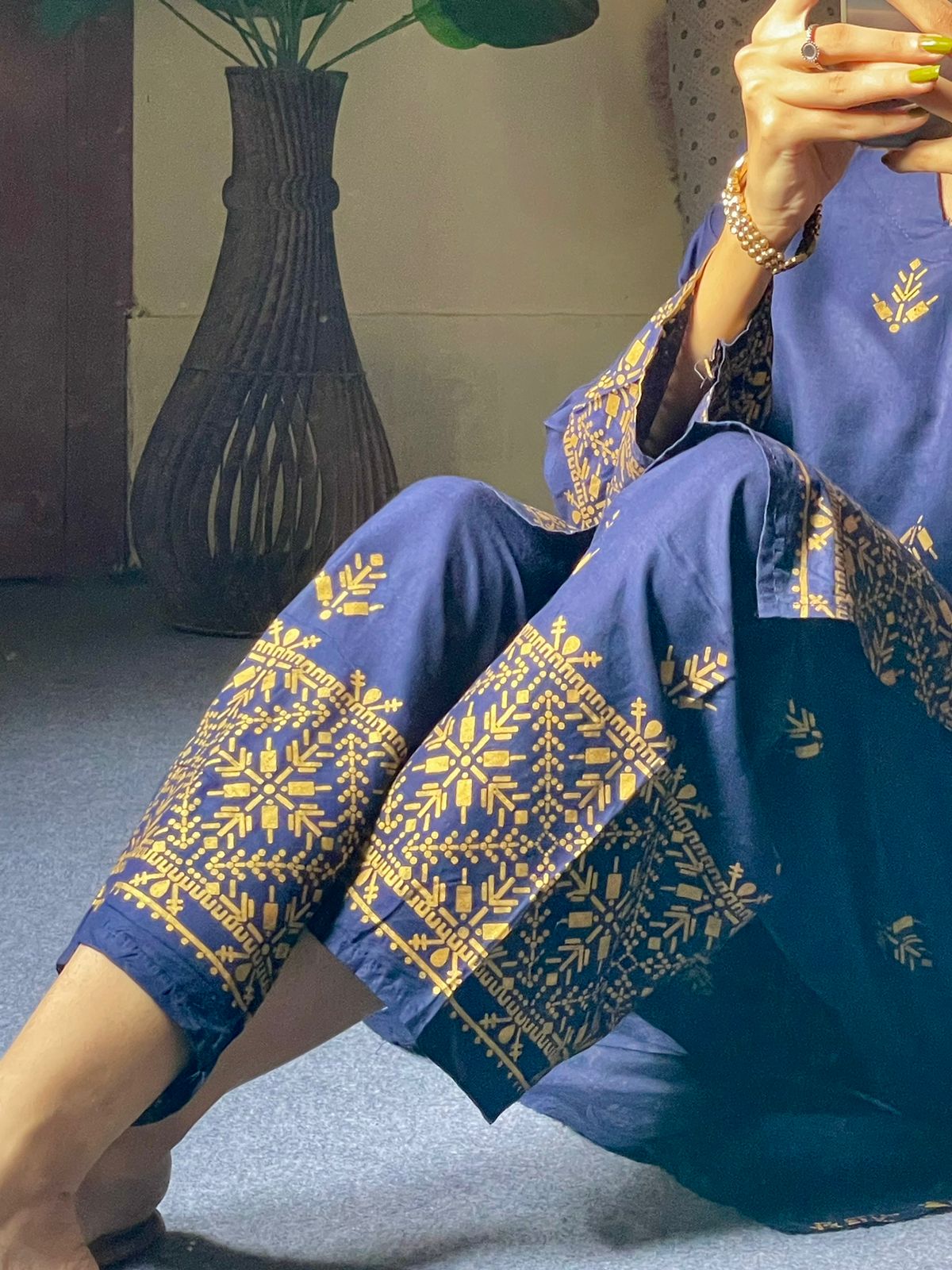 2pcs Block Printed Arrow Design Women's Suit (Navy Blue)